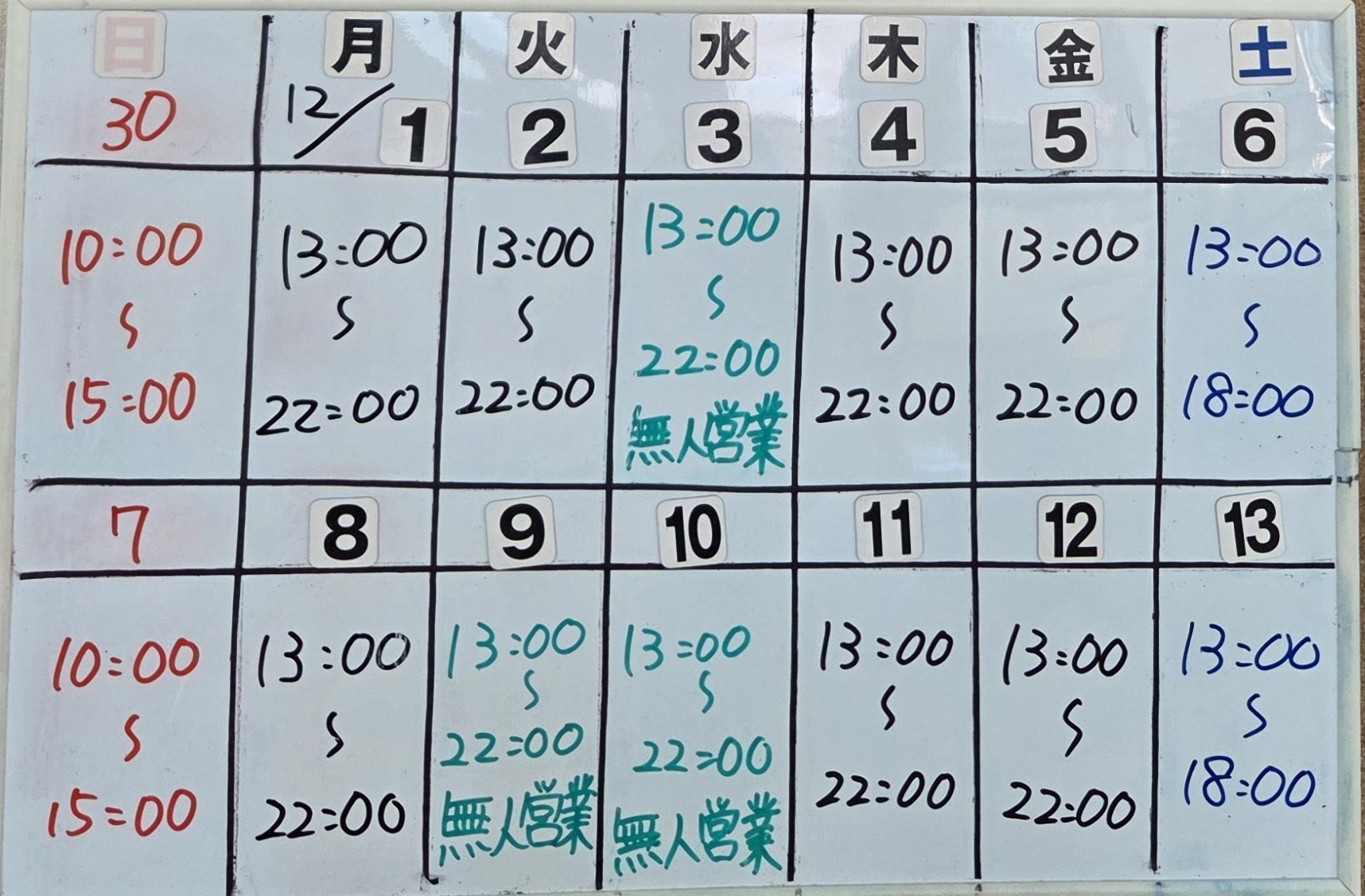11/24(月)~11/30(日)スタッフ在中日時です。 11/24(月)祝日にて 10:00~15:00の営業です 11/26(水) 無人営業です [ …続きを読む ]